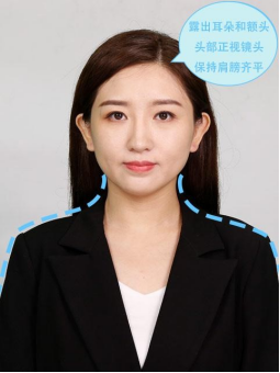 3、露出耳朵和额头,头部正视镜头,保持肩膀齐平,表情自然,嘴唇自然闭合。