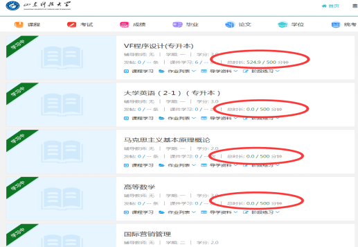 2.在线学习成绩占总成绩的30%,学习时长要求满500分钟由系统自动记录成绩30分,并在期末总成绩汇算时自动计入。学习时长包括视频课件学习,各类教学资源(教学大纲、导学计划、复习思考题等)学习、在线听课学习等累计计算总时长。各教学点要及时督导员工参加在线学习,满足要求即可获得系统自动记录的30分。