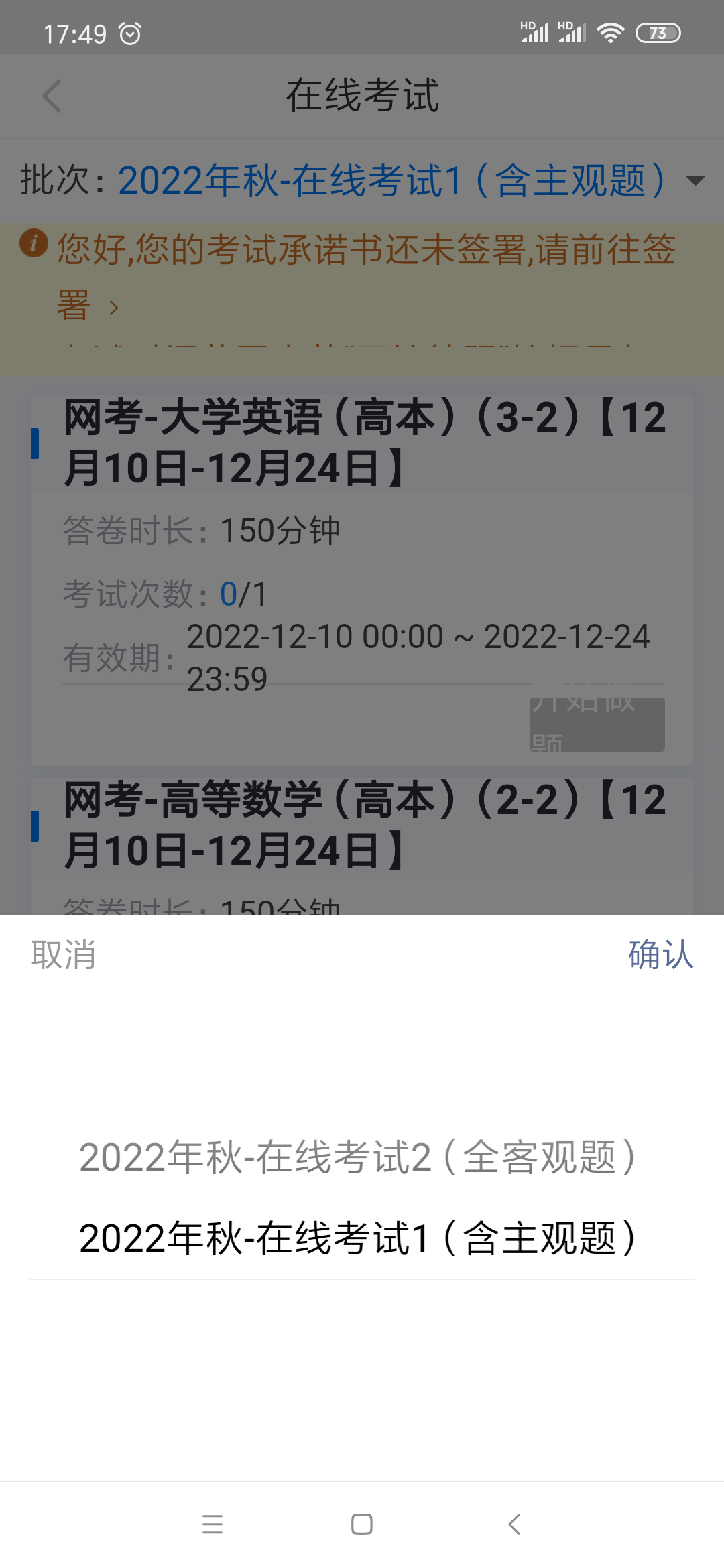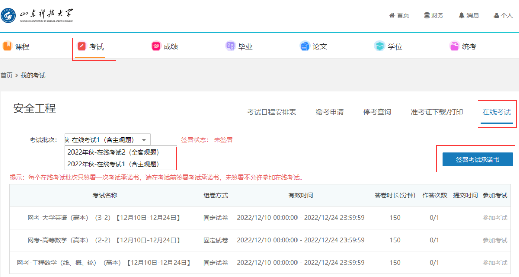 在该页面点击批次,在批次下拉列表中显示“2022年秋-在线考试1(含主观题)”和“2022年秋-在线考试2(全客观题)”批次下需要线上考试的考试课目,核实考试科目后,点击开始答题,即可参加线上考试。