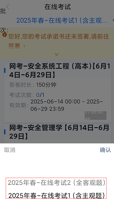 在该页面点击批次,在批次下拉列表中会显示“2025年春-在线考试1(含主观题)”和“2025年春-在线考试2(全客观题)”,核实各批次下考试科目后,点击开始答题,即可参加线上考试。